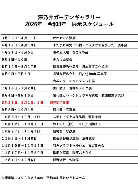 清流ガーデン澤乃井園の敷地内にあるギャラリーです。展示予定は随時更新いたします。
