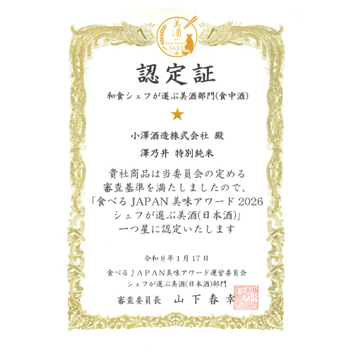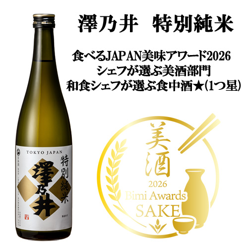 「食べるJAPAN美味アワード2026 シェフが選ぶ美酒部門」において「澤乃井 特別純米」が和食シェフが選ぶ食中酒で★(1つ星)に認定されました。