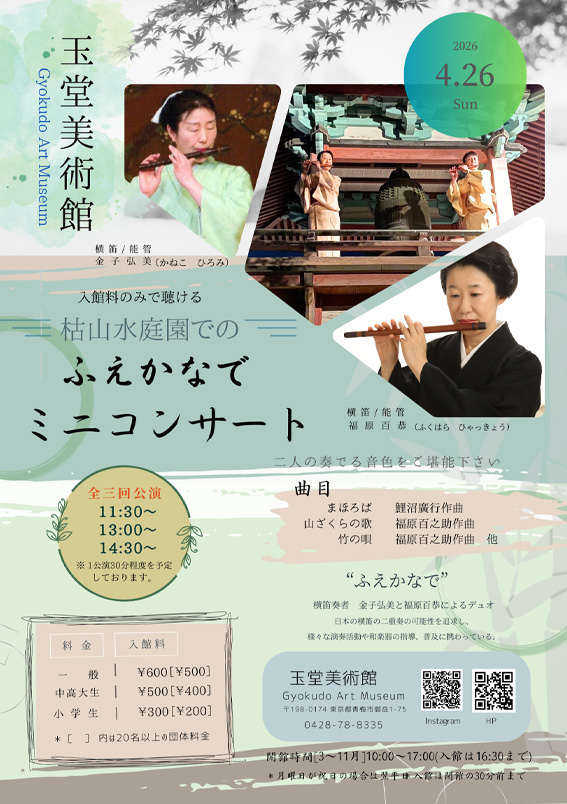 玉堂美術館庭園内にて、入館料のみで聴けるミニコンサートを開催いたします。枯山水庭園にて多摩川のせせらぎとともに音楽をお楽しみください。
