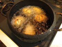 大きめのスプーンを使い楕円形に成型し中温に温めた油で揚げていく。